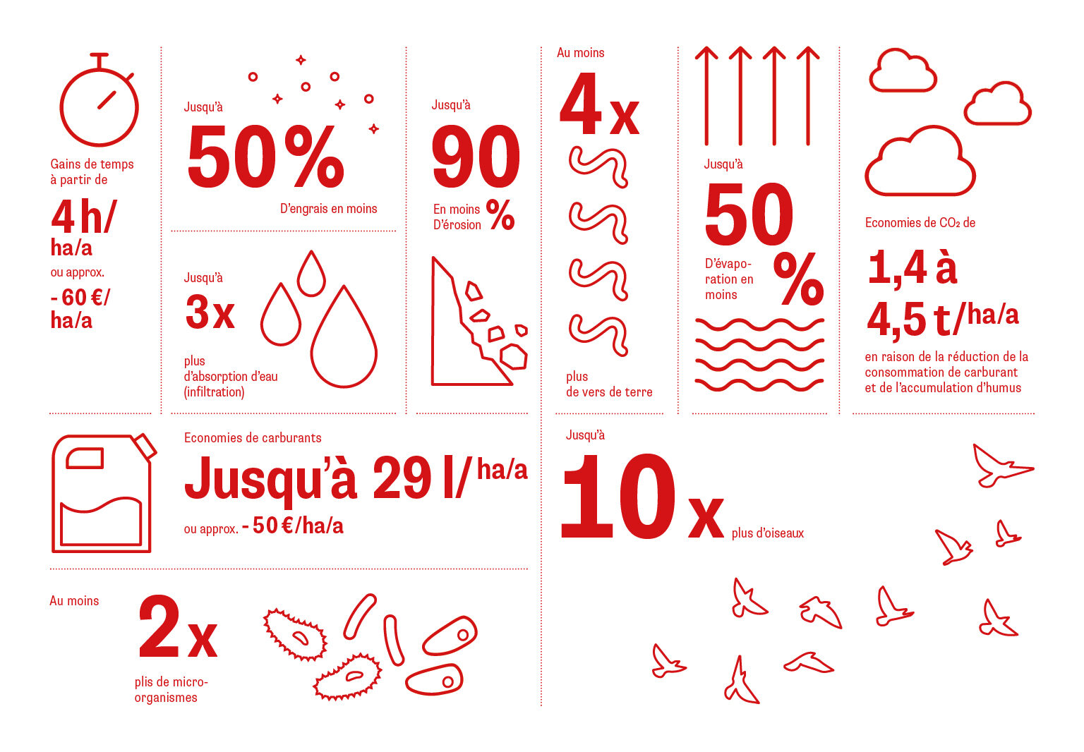 Des rendements stables et des coûts d’intrants nettement inférieurs permettent d’obtenir des marges bénéficiaires plus élevées pour toutes les cultures. Et ce n’est pas tout : les agriculteurs qui passent au semis direct sous couvert peuvent réduire jusqu’à 40% les heures de travail du tracteur.