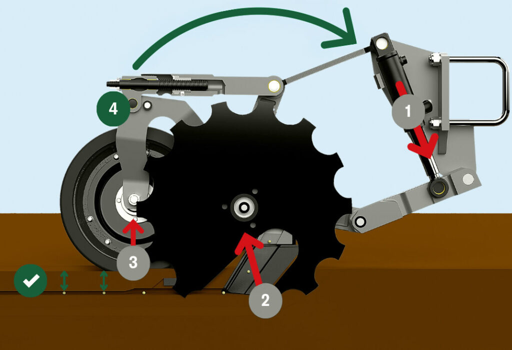 Das Parallelogramm hält die T-Flügelscharspitze in jedem Arbeitsbereich im optimalen Schneidwinkel – für minimale Bodenstörung bei jeder Saattiefe.